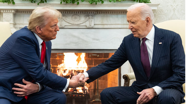 조 바이든(오른쪽) 미국 대통령이 13일(현지시각) 백악관 집무실에서 도널드 트럼프 대통령 당선인과 악수하고 있다. 바이든 대통령은 46개월 만에 백악관을 찾은 트럼프 당선인을 향해 "축하한다"라며 악수를 청했고, 트럼프도 "고맙다"라며 손을 맞잡았다.