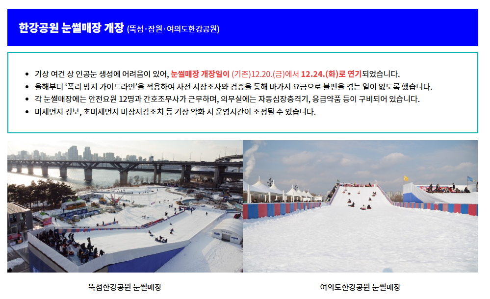 뚝섬 한강공원 눈썰매장은 매년 겨울철마다 운영되며, 2024년에는 12월 24일부터 2025년 2월 16일까지 개장합니다. 이 기간 동안 눈썰매장에서는 다양한 겨울 스포츠와 활동을 즐길 수 있으며, 많은 사람들이 연말과 연초를 맞아 이곳을 찾습니다. 눈썰매장 운영 시간은 날씨와 상황에 따라 변동될 수 있으므로, 방문 전에 사전 확인을 하는 것이 좋습니다. 눈썰매장의 운영 기간은 약 두 달간으로, 이 기간 동안에는 다양한 특별 이벤트와 프로그램이 제공될 수 있습니다. 겨울방학을 맞이한 학생들과 아이들이 겨울을 즐길 수 있는 장소로 이상적인 이곳은, 다양한 연령층이 함께 즐길 수 있는 프로그램을 갖추고 있습니다.